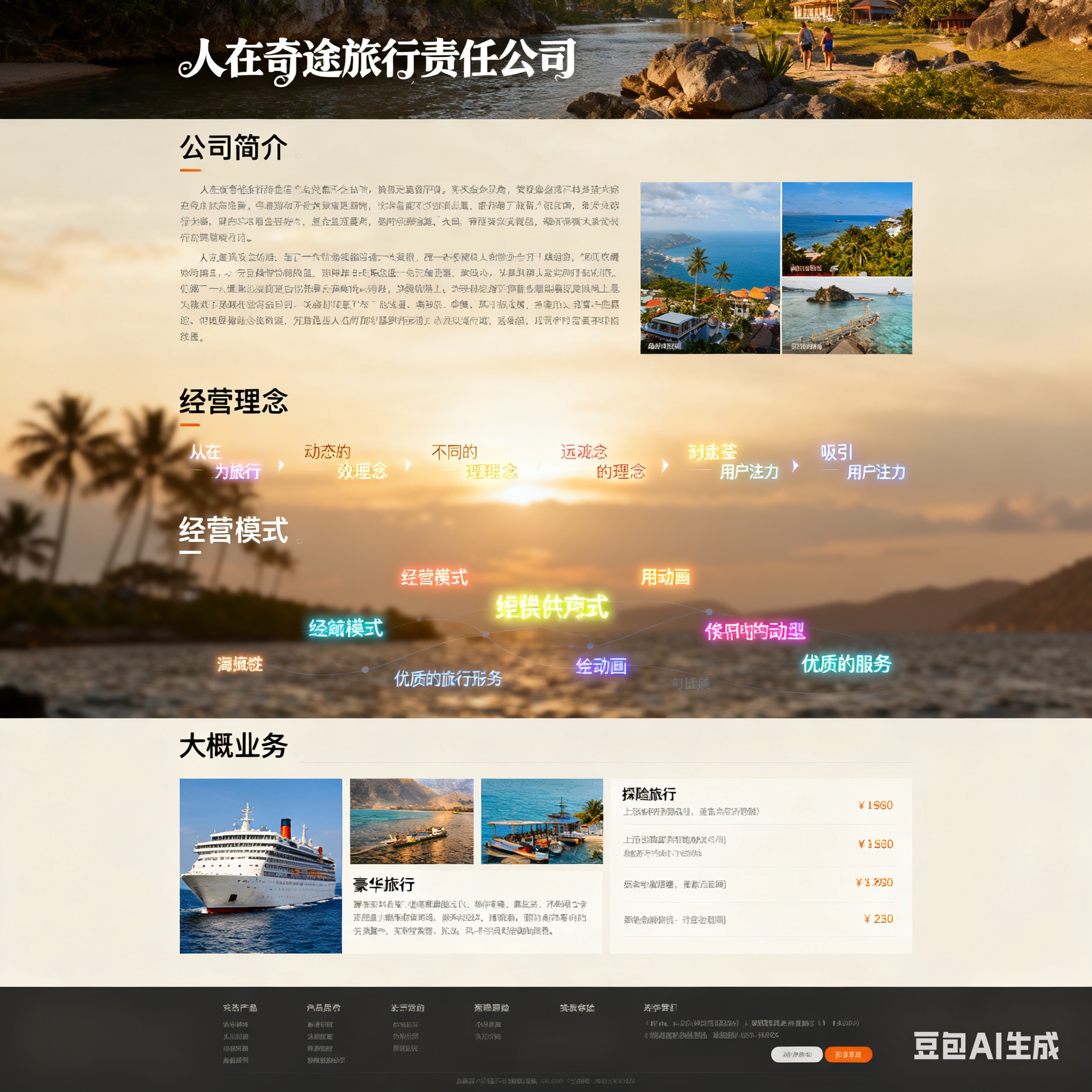 “人在奇途”,以“让每段旅程都有温度,让每次探索都负责任”为初心,是一家专注于“个性化旅行定制+品质服务保障”的综合性旅行服务公司。我们深耕国内外旅行市场,从用户需求出发,打破传统旅行的标准化套路,为不同人群(亲子、情侣、户外爱好者、文化探索者等)打造“小众不撞款、安全有保障、体验有深度”的专属旅行方案。